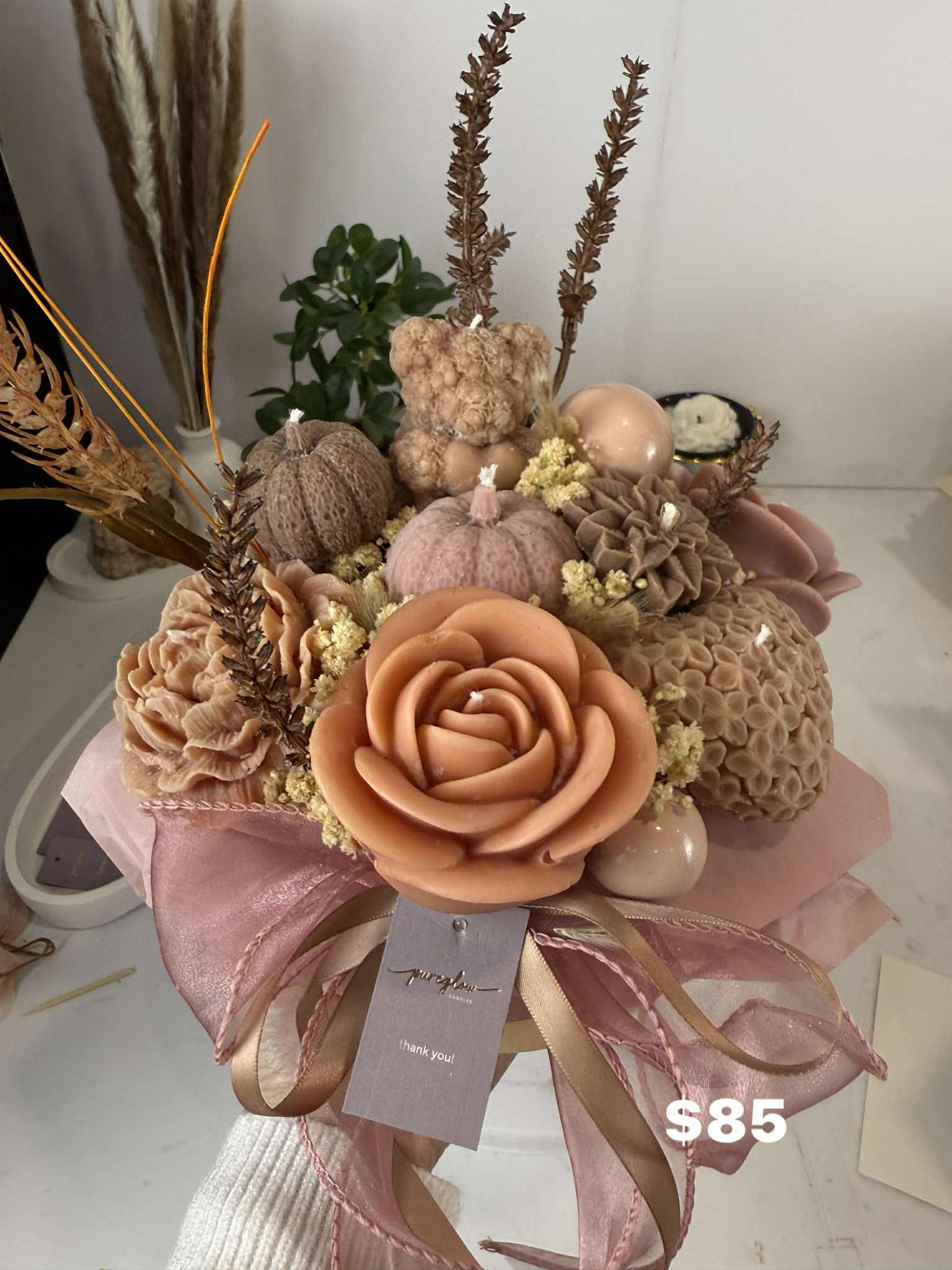 A handcrafted soy wax floral candle bouquet in caramel and blush hues. The Caramel Bloom Candle radiates warmth and quiet luxury — perfect for elegant home décor or heartfelt gifts.
