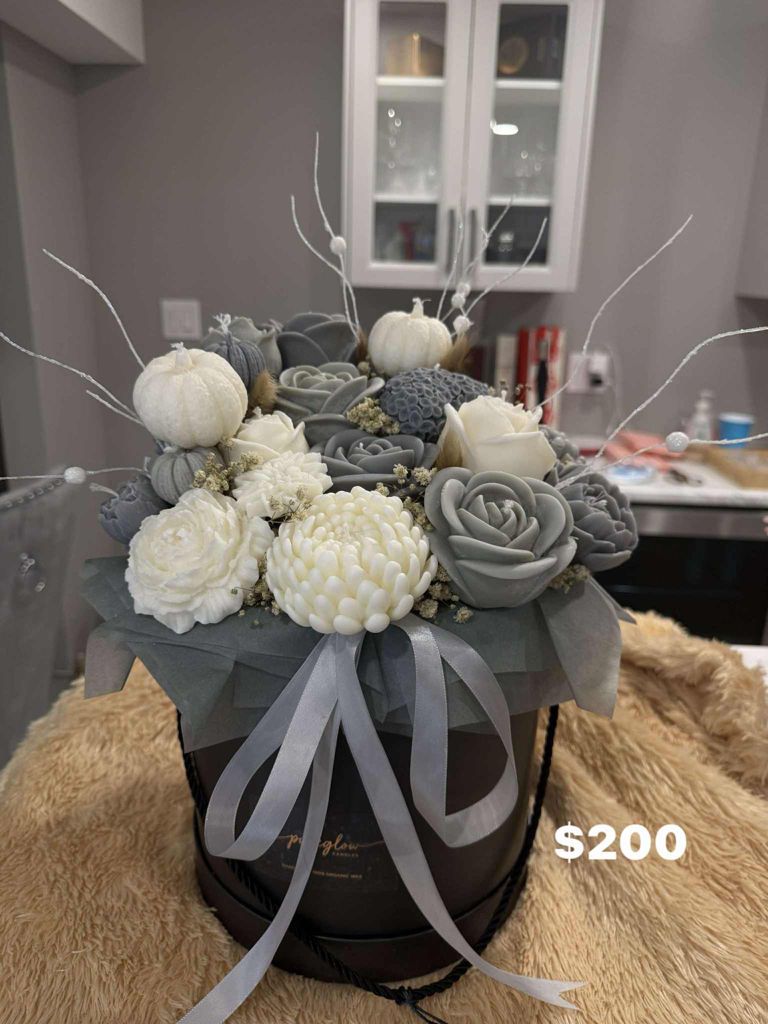 A luxury handcrafted soy wax candle bouquet in elegant grey and ivory hues. The Frosted Elegance Candle exudes refined sophistication — the perfect statement piece or premium gift.