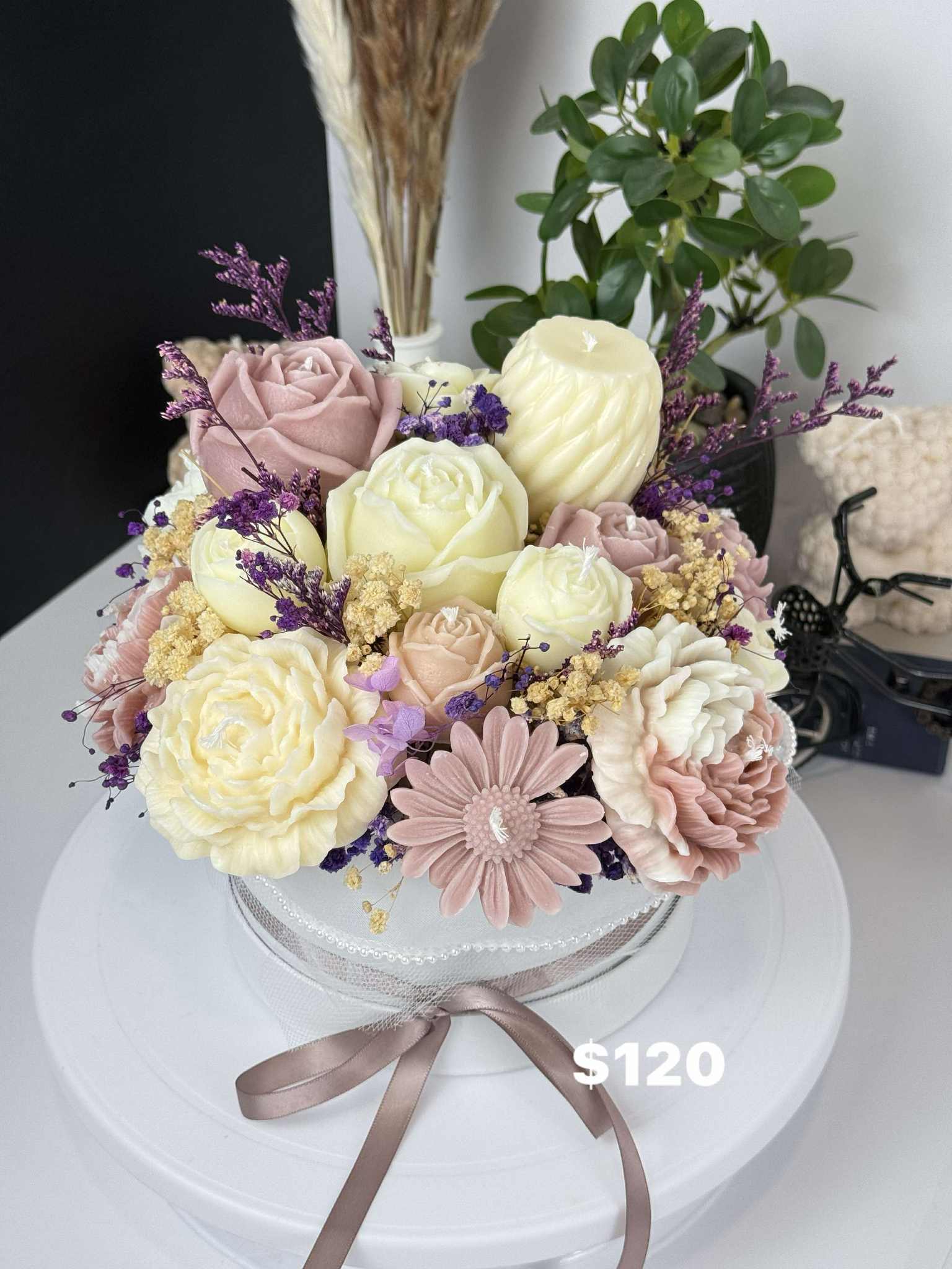 A handcrafted soy wax candle bouquet in delicate pastel hues of lavender, cream, and blush. The Lavender Whisper Candle evokes serenity and timeless elegance — perfect for home décor or gifting.