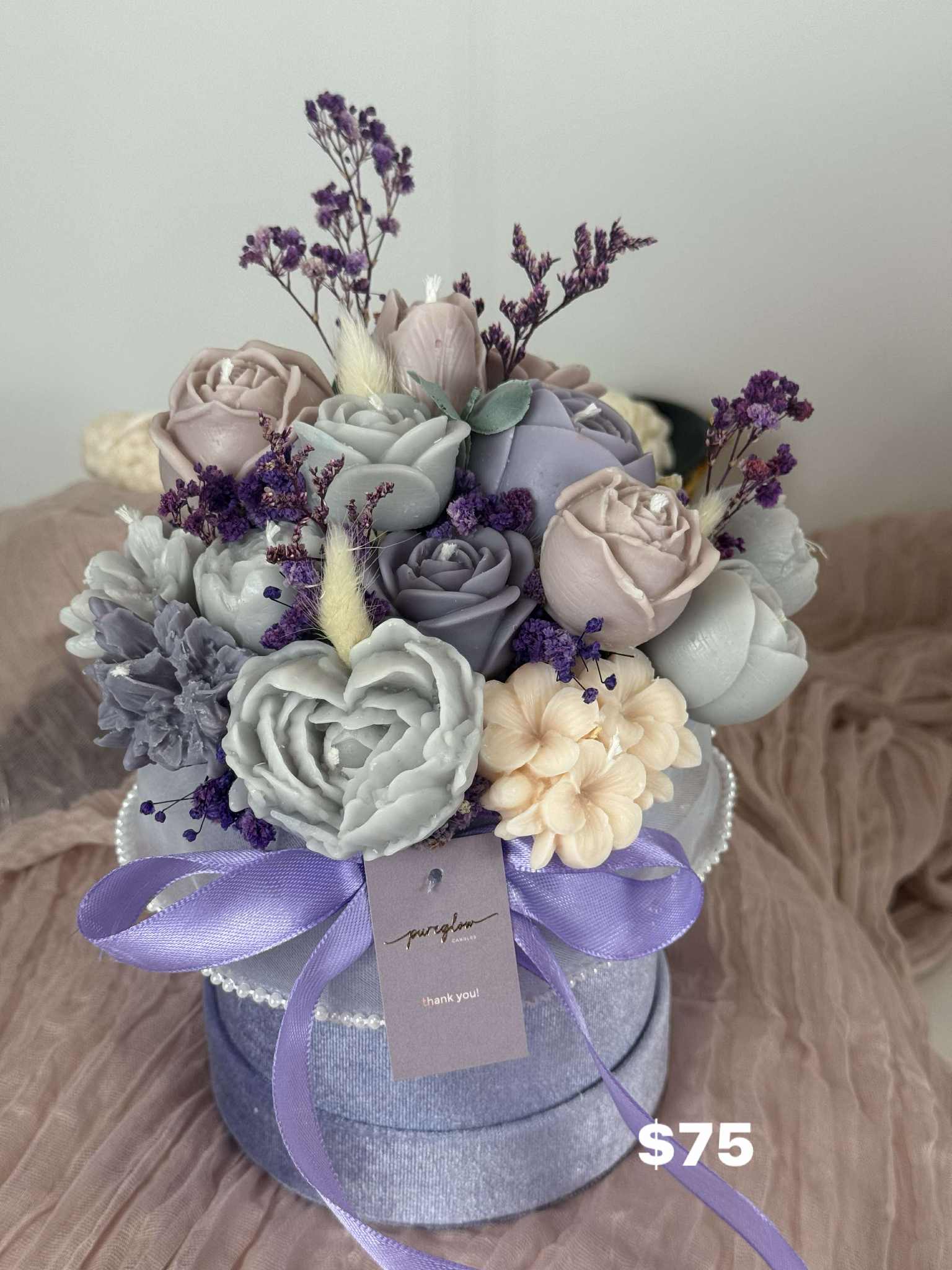 A delicate handcrafted soy wax floral candle bouquet in soft lilac and grey hues. The Misty Lilac Candle evokes calm elegance and serenity — perfect for refined interiors or thoughtful gifts.