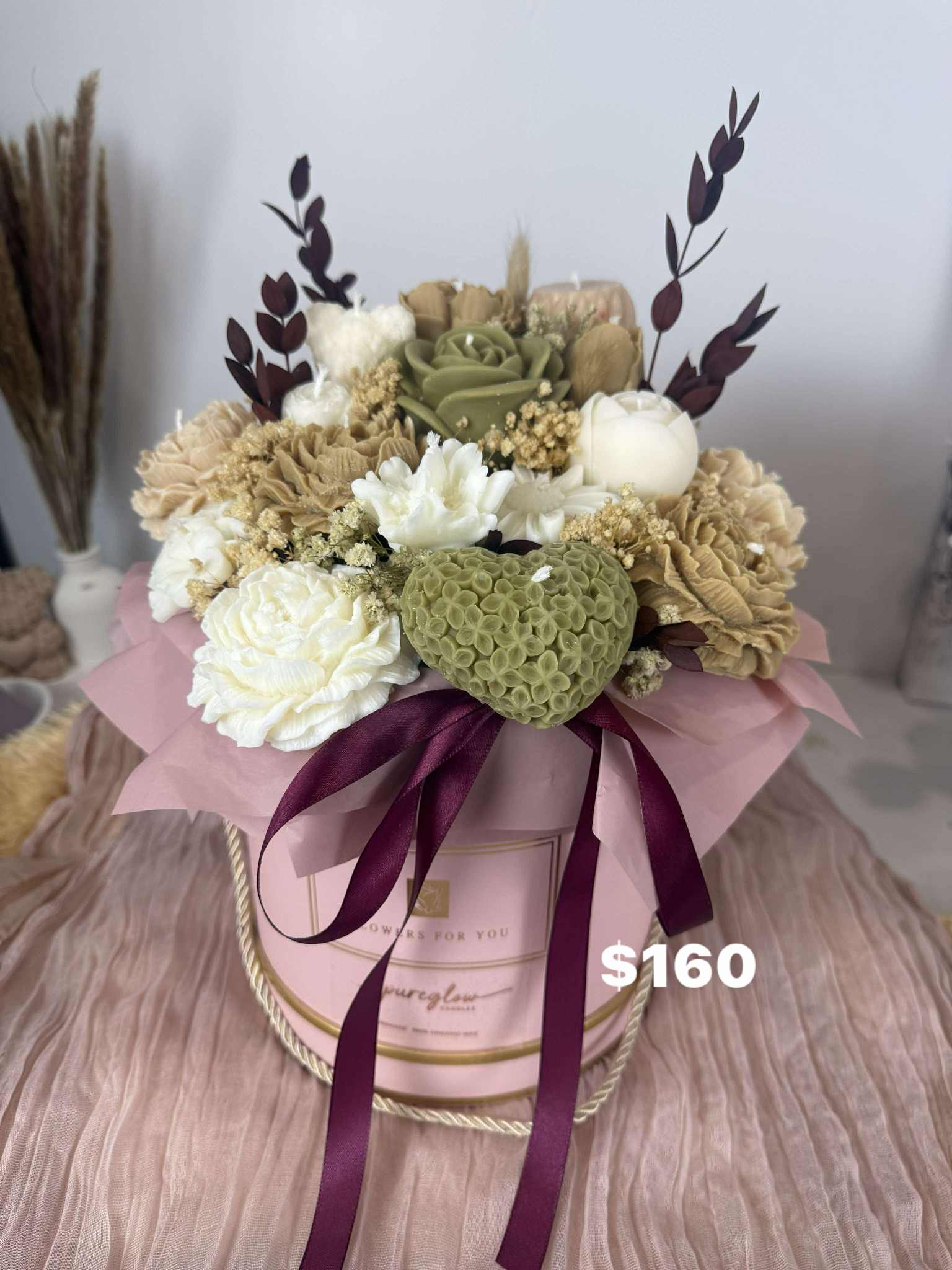 A handcrafted soy wax floral candle bouquet in olive, beige, and ivory hues with a touch of burgundy. The Olive Harmony Candle blends natural tones and refined elegance — ideal for modern interiors or thoughtful gifting.