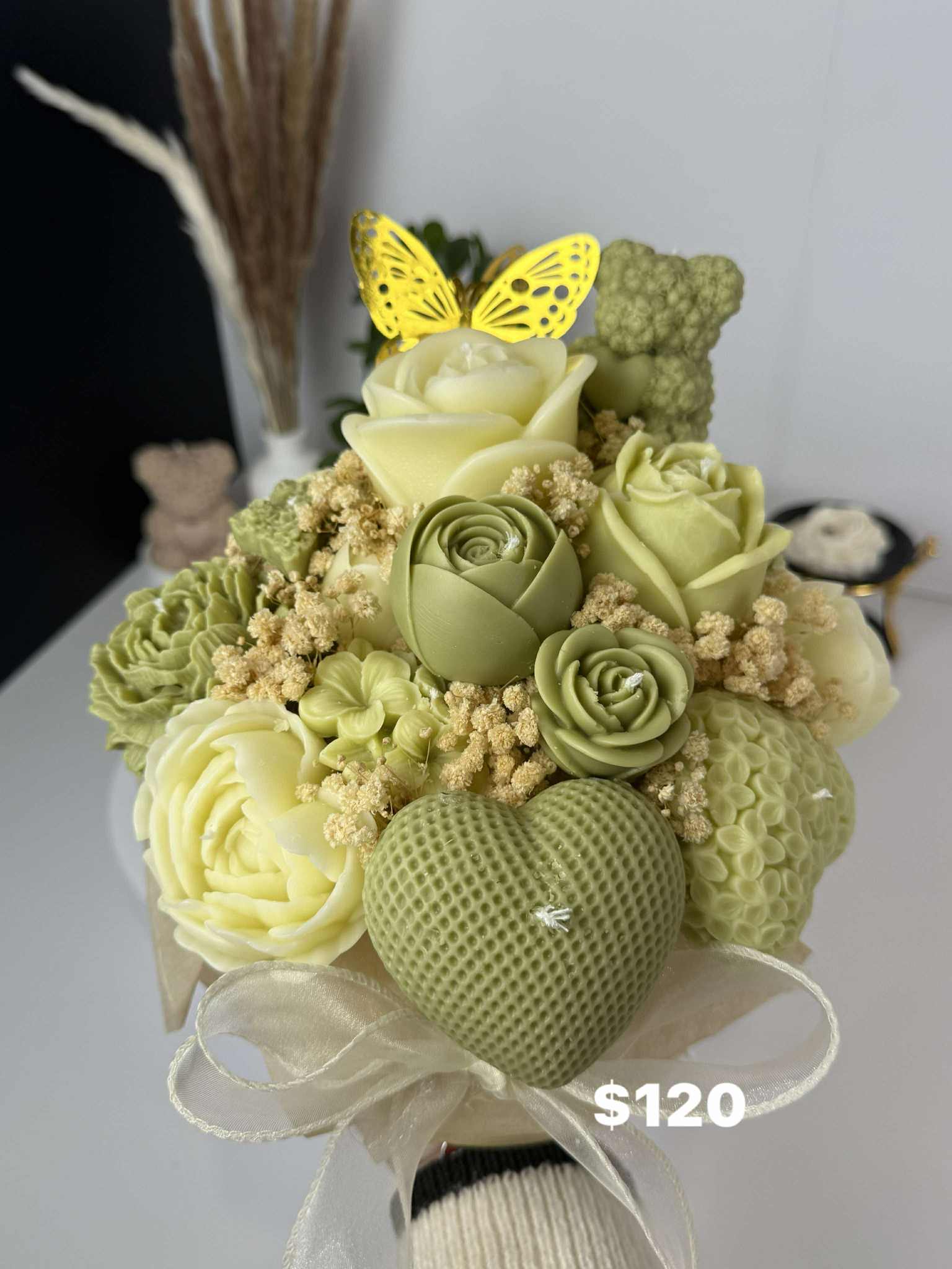 A handcrafted soy wax floral candle bouquet in soft olive and cream hues. The Olive Serenity Candle embodies tranquility and refined beauty — a perfect choice for calming interiors or heartfelt gifts.
